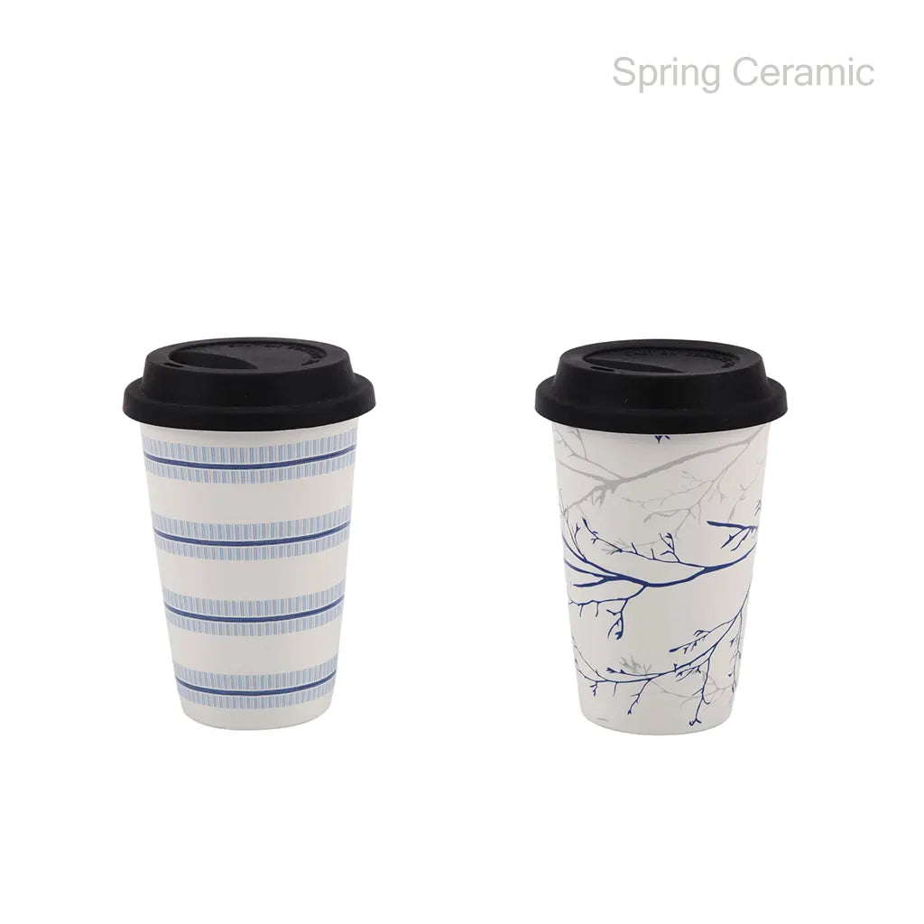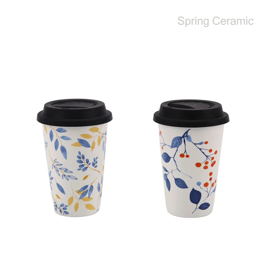 "ceramic wholesale" 400ml floral ceramic travel mug with silicone lid